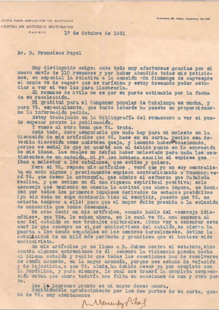 Diez días después, Menéndez Pidal contestaba mediante una carta mecanografiada que lleva el membrete del Centro de Estudios Históricos: