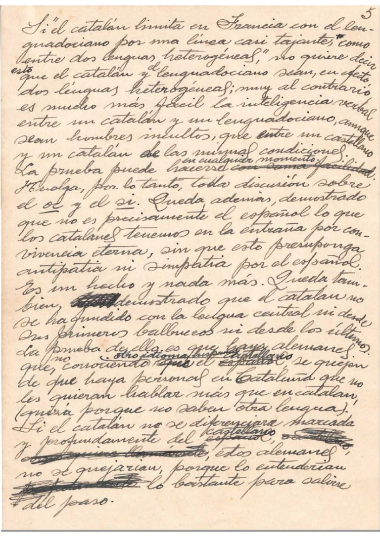 Si “el catalán limita en Francia con el lenguadociano por una línea casi tajante, como entre dos lenguas heterogéneas”, no quiere decir esto que el catalán y el lenguadociano sean, en efecto, dos lenguas heterogéneas; muy al contrario, es mucho más fácil la inteligencia verbal entre un catalán y un lenguadociano, aunque sean hombres incultos, que entre un castellano y un catalán de las mismas condiciones. La prueba puede hacerse [tacha: con suma facilidad] en cualquier momento. Huelga, por lo tanto, toda discusión sobre el oc y el sí. Queda, además, demostrado que no es precisamente el español lo que los catalanes tenemos en la entraña por convivencia eterna, sin que esto presuponga antipatía ni simpatía por el español. Es un hecho y nada más. Queda también demostrado que el catalán no se ha fundido con la lengua central ni desde sus primeros balbuceos ni desde los últimos. La prueba de ello es que haya alemanes que, no conociendo otro idioma hispano que el castellano [tacha: español] se quejen de que haya personas en Cataluña que no les quieran hablar más que en catalán (quizá porque no saben otra lengua!). Si el catalán no se diferenciara marcada y profundamente del castellano [tacha: español o castellano o lo que quiera llamársele], estos alemanes no se quejarían, porque lo entenderían lo bastante [tacha: perfectamente] para salirse del paso.