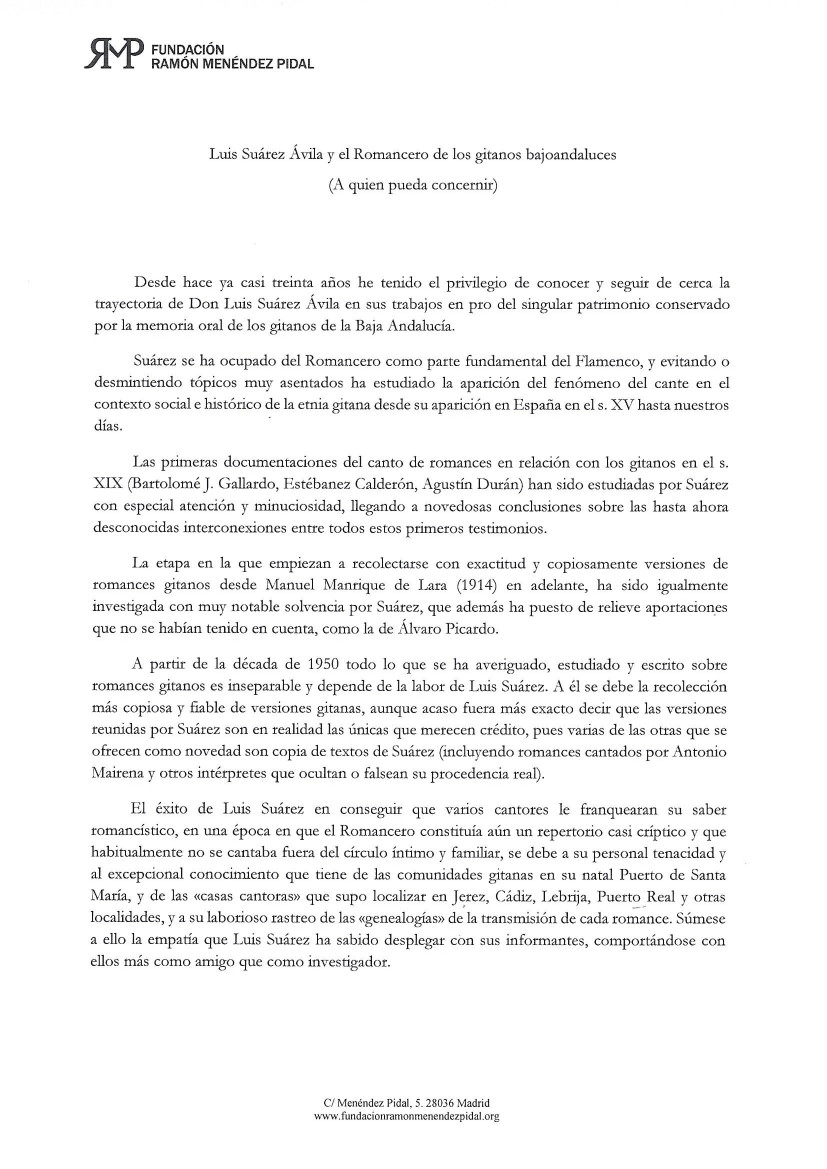 Luis Suárez ha sido uno de los más antiguos y firmes amigos de la Fundación Menéndez Pidal. Conoció a Jimena Menéndez Pidal y escribió sobre ella y la visita de don Ramón a los barrios gitanos de Granada en compañía de Federico García Lorca. Con Diego Catalán mantuvo una larga relación de admiración mutua, y esa misma admiración y amistad es la que hemos continuado quienes aquí laboramos, y que ahora convertimos, forzosamente, en recuerdo y añoranza.