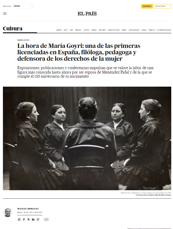 Manuel Morales, periodista cultural del diario El País, ha publicado un amplio reportaje sobre María Goyri con motivo de la conmemoración del 150 aniversario de su nacimiento. El artículo titulado “La hora de María Goyri: una de las primeras licenciadas en España, filóloga, pedagoga y defensora de los derechos de la mujer” hace un amplio recorrido por la vida y obra de Goyri.