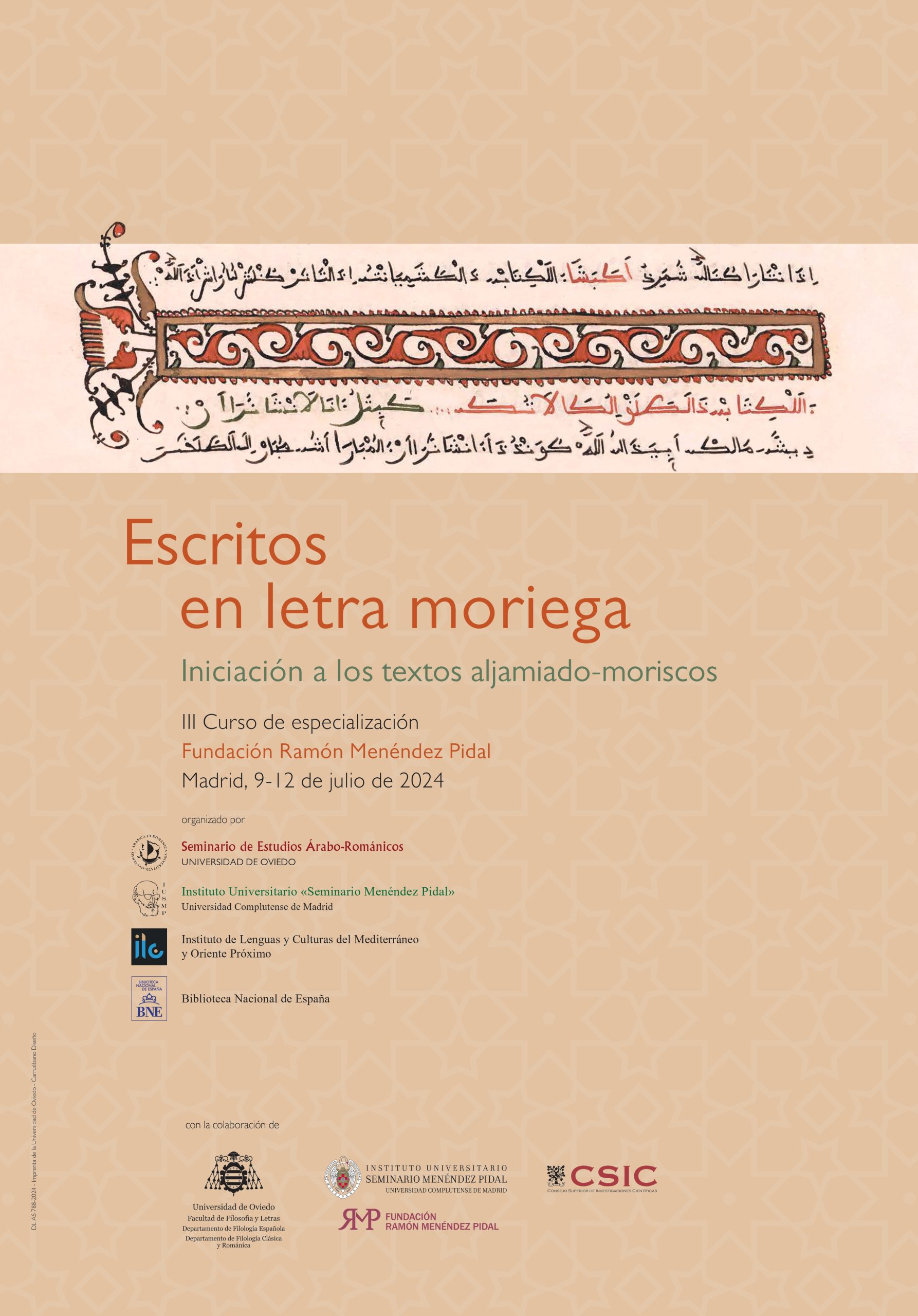 El Seminario de Estudios Árabo-Románicos ofrece esta tercera edición del curso de iniciación a los estudios aljamiados, co-organizado por el Instituto Universitario «Seminario Menéndez Pidal», el Instituto de Lenguas y Culturas del Mediterráneo (CSIC) y la Biblioteca Nacional de España, y acogido en la sede de la Fundación Menéndez Pidal.