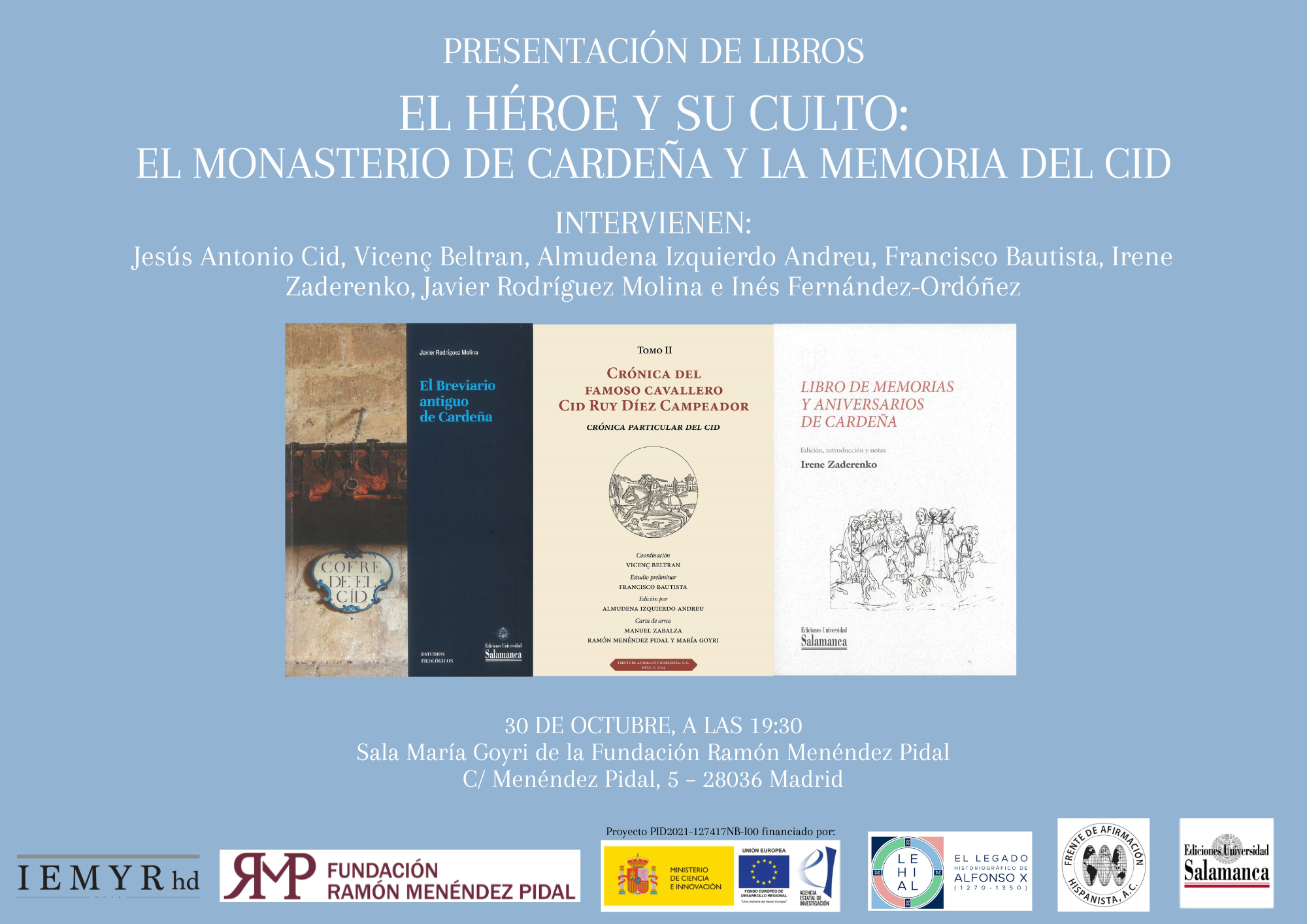 La Fundación Ramón Menéndez Pidal se honra en albergar la presentación de estas obras en un acto público con intervención de los editores. Un ulterior coloquio dará ocasión a exponer y discutir el estado actual de la investigación sobre la relación entre la cronística medieval y la poesía épica castellana, la debatida cuestión de la propaganda monástica en la difusión de las leyendas heroicas, los más recientes hallazgos de la historiografía alfonsí, y cualquier otro tema de interés que los ponentes y asistentes quieran plantear.