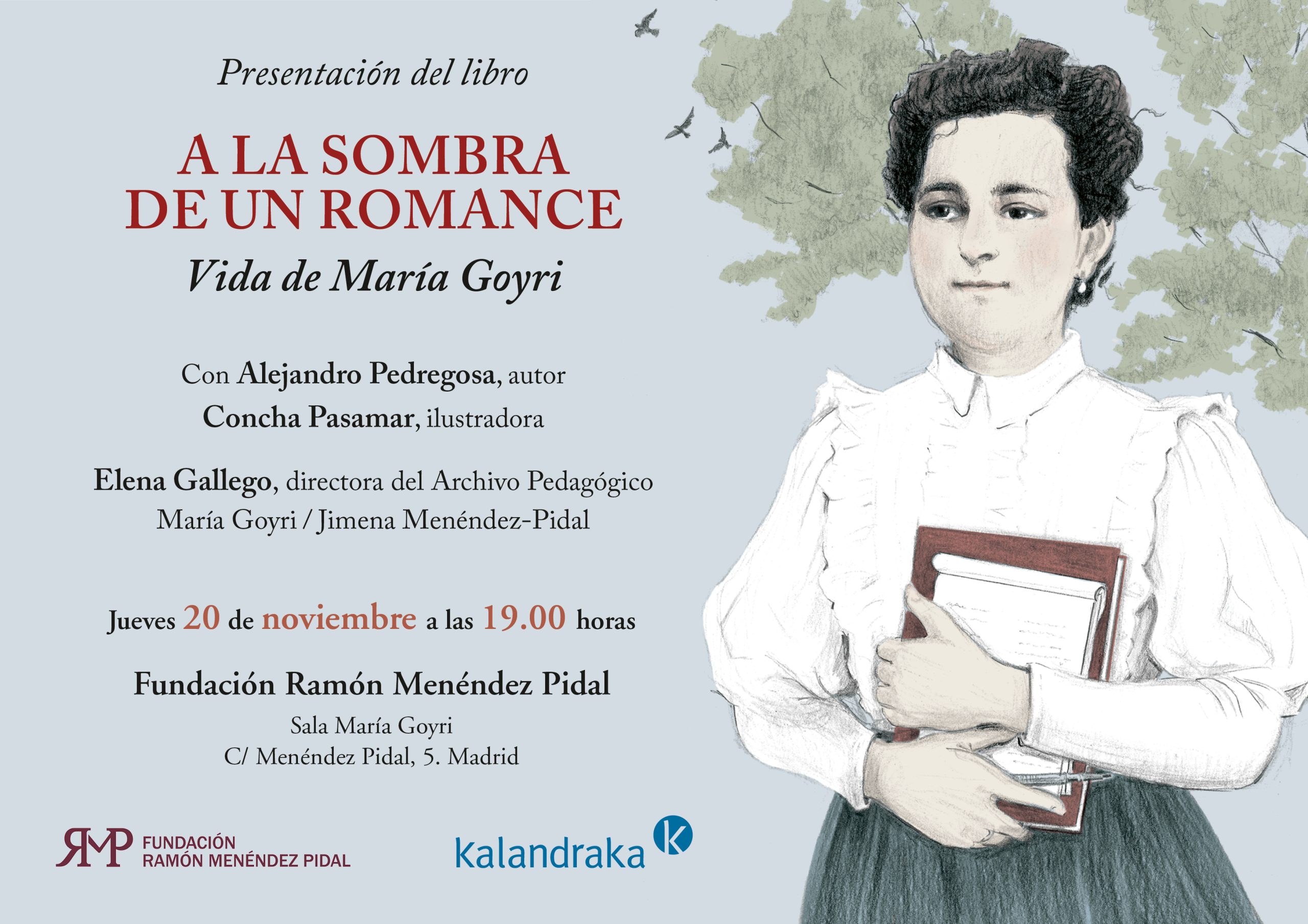 Este mes de noviembre ha llegado a las librerías el cuarto título de la colección ‘Biografías’ de la editorial Kalandraka donde ya encontramos obras dedicadas a María Zambrano, María Moliner y Carmen de Burgos. A la sombra de un romance, con texto de Alejandro Pedregosa e ilustraciones de Concha Pasamar, se acerca a la vida de María Goyri. Profesora, investigadora, recolectora de romances, pionera del feminismo… esta biografía ilustrada recupera y reivindica su legado intelectual, pedagógico y cultural.