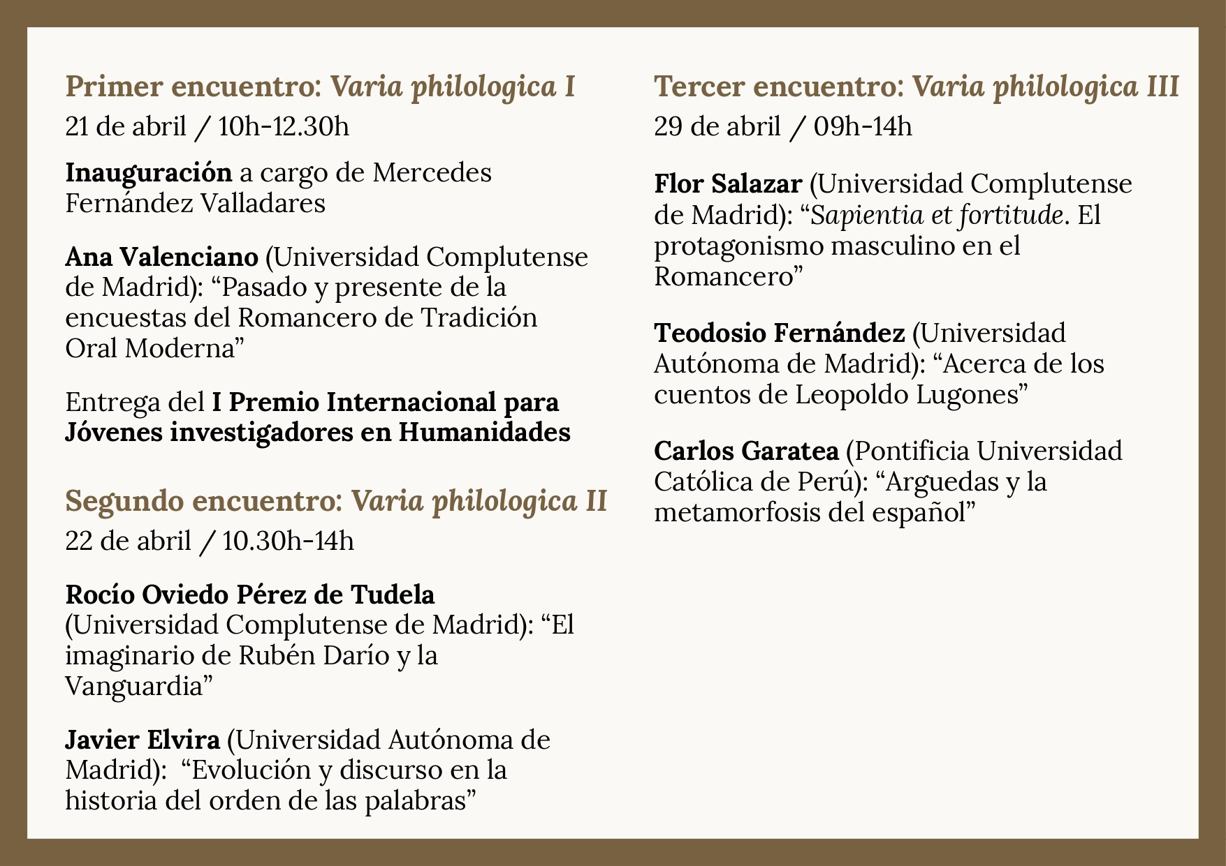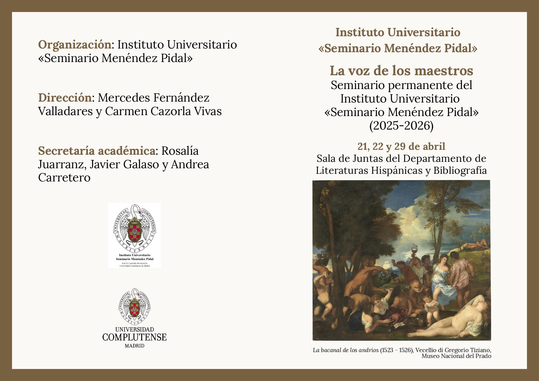 Ver imagen más grande Seminario Permanente del IUSMP: «La voz de los maestros» 21, 22 y 29 de abril de 2026 Sala de Juntas del Departamento de Literaturas hispánicas y Bibliografía Facultad de Filología (Edif. D) Asistencia presencial o en línea (previa inscripción) Enlace al cartel y al programa fmp-ghezzi-20202026-04-20T09:46:28+00:00 . FacebookTwitterWhatsAppCorreo electrónico Artículos relacionados «Conservar los ideales educativos de la JAE en la Segovia de la Guerra Civil. La familia Menéndez Pidal Goyri (1936-1939)», por Elena Gallego abril 20th, 2026 | Sin comentarios Presentación del libro «Romancero complutense» abril 16th, 2026 | Sin comentarios Jornada Científica y Exposición fotográfica: «Un álbum fotográfico para el Comisario Regio. El primer viaje a América de Ramón Menéndez Pidal» abril 13th, 2026 | Sin comentarios Exposición de Juan Higueras y Alessandro Taiana abril 12th, 2026 | Sin comentarios Deja tu comentario Cancelar la respuestaComentar Guardar mi nombre, email y sitio web en este navegador para la próxima vez que comente.
